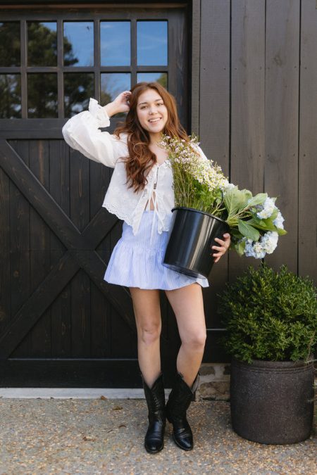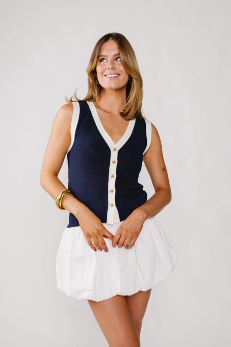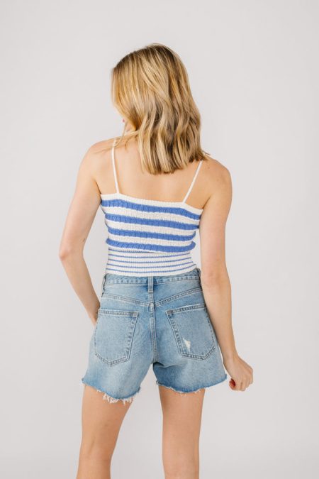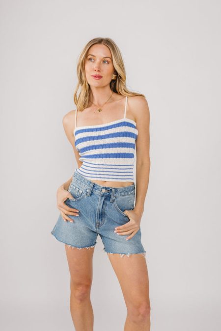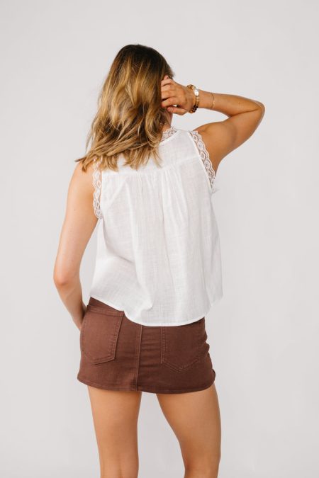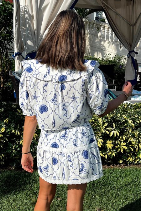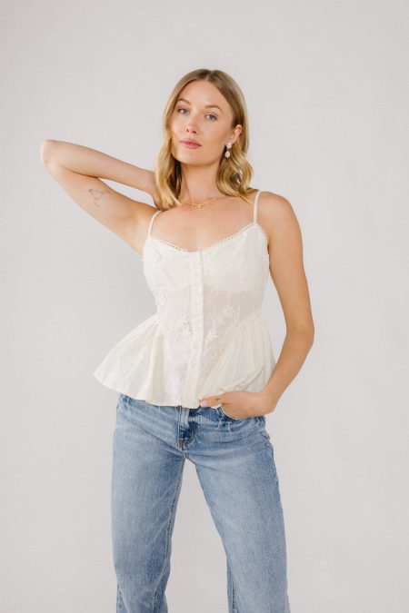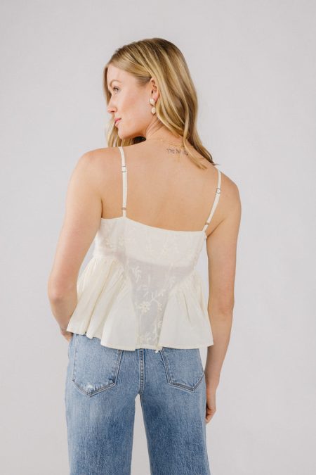 $256.00Details Ivory tank top with teal embroideryCropped lengthElastic band above bustSpaghetti straps tie at shoulderScalloped hemBuilt in elastic shelf braMatching skirt sold separately Materials and Care Self: 100% cottonLining: 100% rayonHand wash coldHang or line dry All sale items are considered final sale.