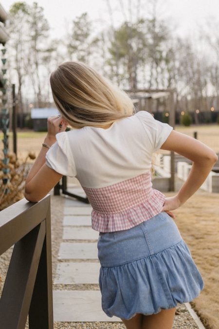 $77.00Details Pink and white gingham corset style topWhite sheer neckline and sleevesShort puff sleeves with elastic cuffsRuffled hemSelf-tie closure at neckHidden side zipper Materials and Care Self: 50% viscose, 20% cotton, 20% polyester, 10% nylonContrast: 70% rayon, 30% tencelLining: 100% rayonHand wash coldLay flat to dry All sale items are…